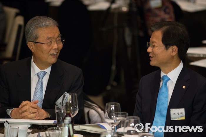 (서울=포커스뉴스) 9일 오후 서울 여의도구 63빌딩 그랜드볼룸에서 열린 '6.15 남북정상회담 16주년 기념식'에 참석한 김종인 더불어민주당 비상대책위원회 대표(왼쪽)와 천정배 국민의당 공동대표가 대화하고 있다.