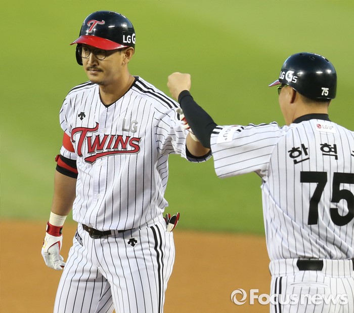 (서울=포커스뉴스) 8일 서울 잠실구장에서 열린 2016 프로야구 삼성-LG 경기 3회말 2사 만루에서 LG 박용택이 2타점 우중간 안타를 치고 한혁수 코치와 주먹을 마주치고 있다.