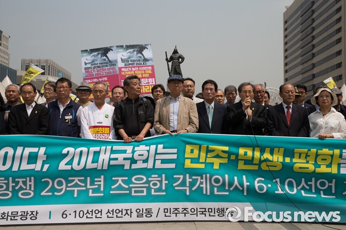 (서울=포커스뉴스) 10일 오전 서울 종로구 광화문 광장에서 민주주의국민행동 단체 회원들이 6.10 민주항생 29주년 관련 기자회견을 하고 있다.