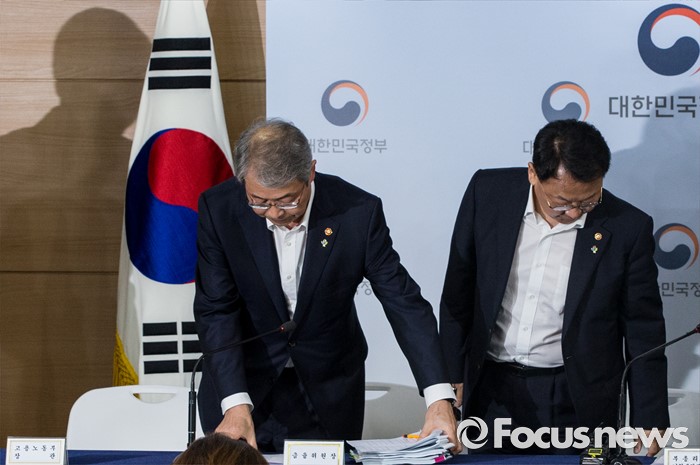 (서울=포커스뉴스) 8일 오전 서울 종로구 정부서울청사에서 임종룡(왼쪽) 금융위원장과 유일호 부총리 겸 기획재정부 장관이 구조조정 추진현황 및 계획에 대해 발표를 마친 후 자리를 나서고 있다.