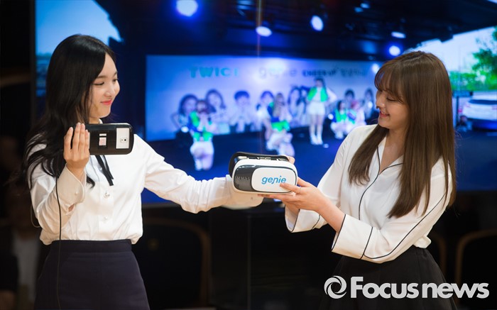 (서울=포커스뉴스) 9일 오전 서울 종로구KT스퀘어에서 열린 KT뮤직 VR서비스 론칭 기자간담회에 참석한 걸그룹 트와이스의 멤버 나연(왼쪽)이 지효에게 체험용 기기를 전달받고 있다.