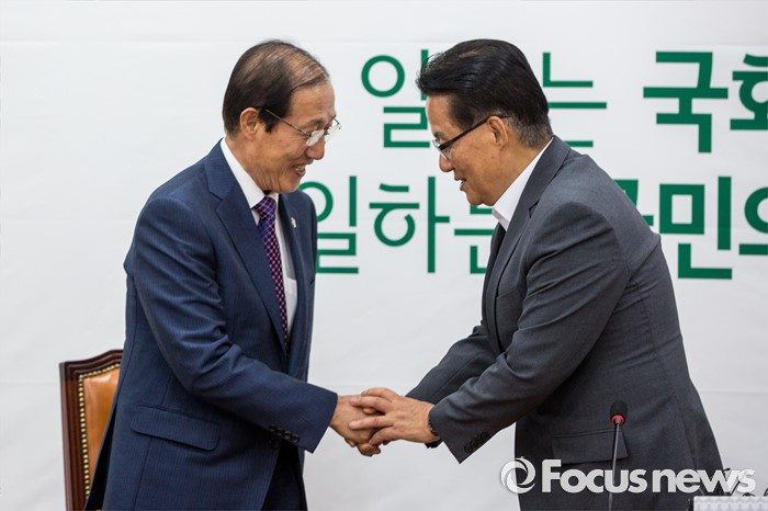 (서울=포커스뉴스) 박지원(오른쪽) 국민의당 원내대표가 10일 오후 서울 여의도 국회에서 이원종 대통령비서실장과 면담을 마친 뒤 악수 하고 있다.