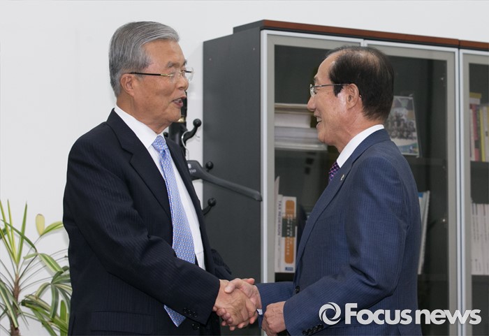 (서울=포커스뉴스) 김종인(왼쪽) 더불어민주당 비대위 대표가 10일 오후 서울 여의도 국회를 방문한 이원종 대통령비서실장과 면담에 앞서 인사하고 있다.