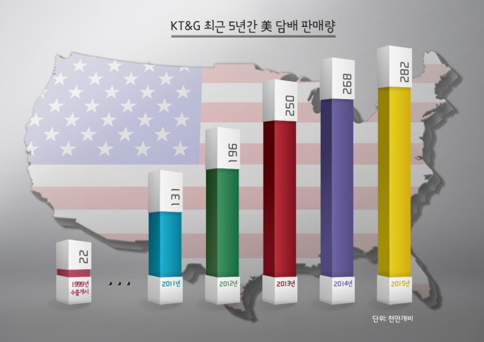 지난해 KT&G의 미국 수출량은 역대 최고치인 28억 2000만개비를 기록했다. 이는 미국 수출 첫 해인 1999년에 기록한 2억2000만 개비와 비교해 1200% 가까이 증가한 수치이다.