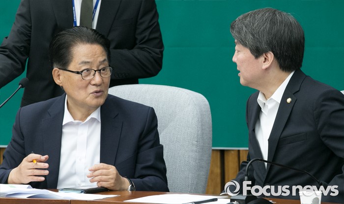 (서울=포커스뉴스) 9일 오전 서울 여의도 국회에서 국회 부의장 후보 선출을 위해 열린 국민의당 의원총회에 참석한 안철수(오른쪽) 상임공동대표와 박지원 원내대표가 대화하고 있다.