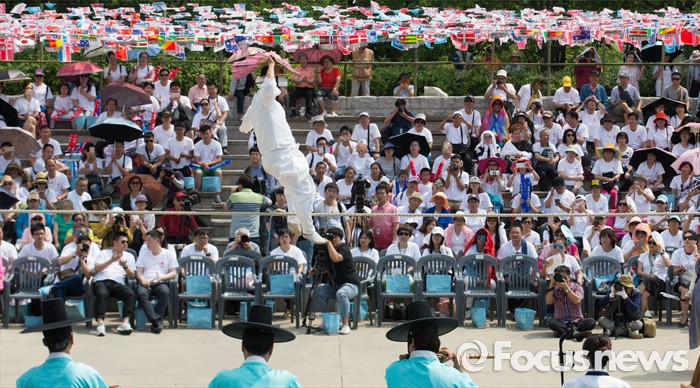 (서울=포커스뉴스) 9일 오후 단오 세시풍속을 체험하기 위해 서울 중구 남산 한옥마을을 방문한 중국 관광객들이 외줄타기를 관람하고 있다.