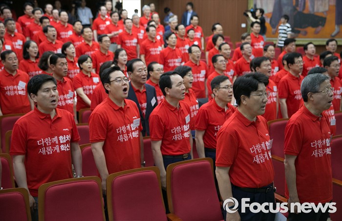 (과천=포커스뉴스) 10일 오전 경기도 과천 국가공무원인재개발원에서 열린 2016 새누리당 정책워크숍에 참석한 김희옥 혁신비대위원장, 권성동 사무총장 등 의원들이 애국가를 부르고 있다.