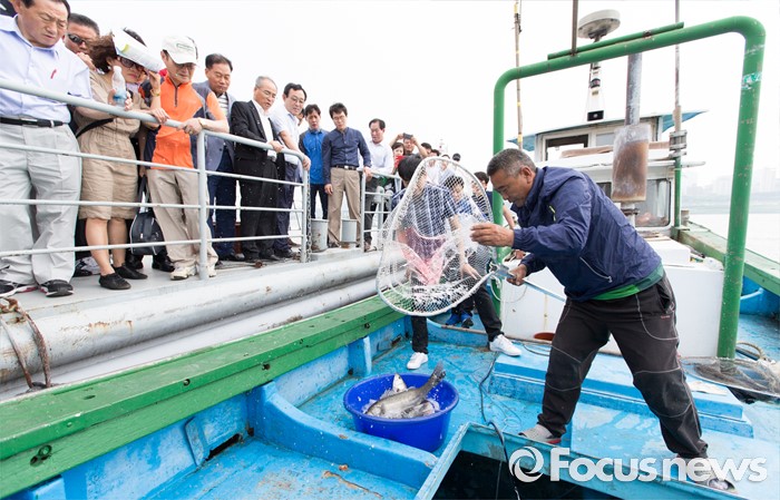 (서울=포커스뉴스) 10일 오후 서울 성동구 뚝도나루에서 박태원 연평면 어촌계장이 서해 5도산 활어를 꺼내고 있다. 6월부터 8월까지 2, 4주 금요일에 뚝도시장에 수산물 장서는 날을 운영하며 9월부터는 7일장 형태로 상설운영 할 예정이다.