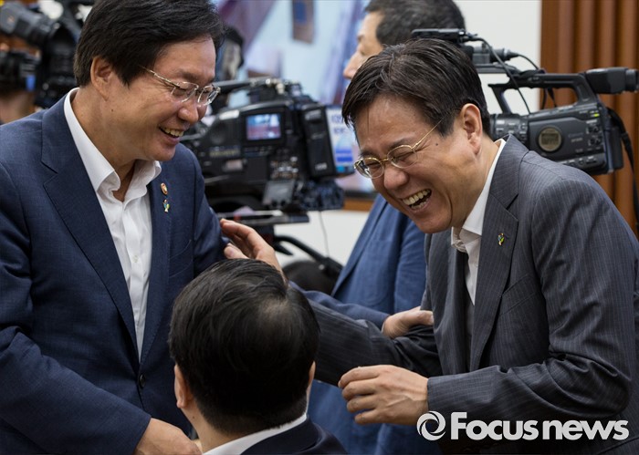 (서울=포커스뉴스) 8일 오전 서울 종로구 정부서울청사에서 열린 구조조정 관계장관회의에 참석한 김영석 해양수산부 장관(왼쪽)과 이관섭 산업통상자원부 1차관이 밝게 웃고 있다.