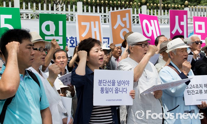 (서울=포커스뉴스) 8일 오전 서울 종로구 정부서울청사 앞에서 615공동선언실천 남측위원회가 6.15공동선언발표 16주년 기념 남북관계 개선 촉구 기자회견을 하고 있다.