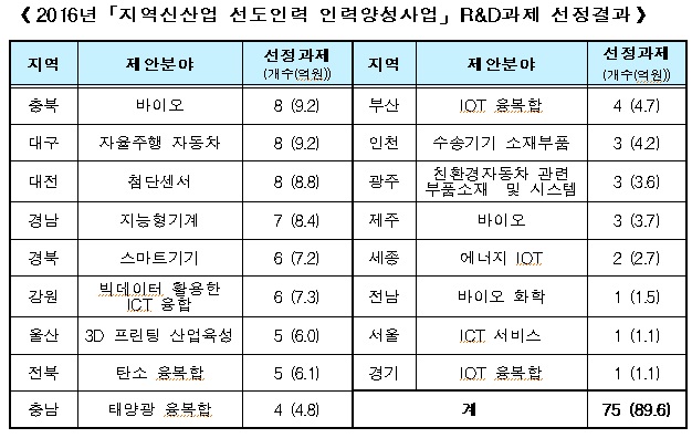미래창조과학부는 10일 ‘지역신산업 선도인력 양성사업’의 2016년 신규과제 최종 선정결과를 발표했다. 지역신산업 선도인력 양성사업은 창조경제혁신센터를 중심으로 지역대학 및 지역기업이 공동 연구수행을 통해 지역 전략산업분야의 지역 기업의 연구역량을 강화하기 위해 추진하고 있는 사업이다.