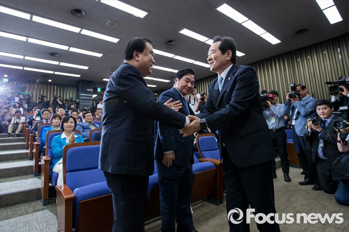 (서울=포커스뉴스) 정세균 더불어민주당 의원이 9일 오전 서울 여의도 국회에서 열린 의원총회에서 20대 국회 전반기 국회의장 후보로 선출된 뒤 문희상 의원과 악수 하고 있다.
