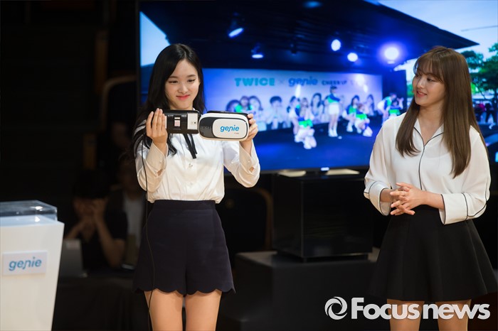(서울=포커스뉴스) 9일 오전 서울 종로구KT스퀘어에서 열린 KT뮤직 VR서비스 론칭 기자간담회에 참석한걸그룹 트와이스의 멤버 나연(왼쪽)과 지효가 관련 서비스를 시연하고 있다.