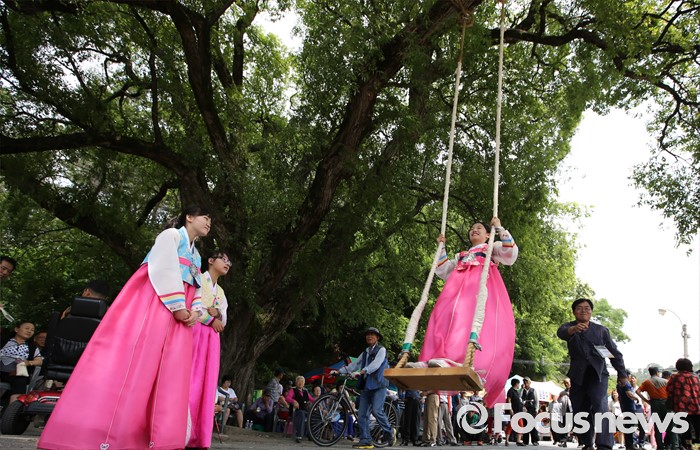 (대전=포커스뉴스) 9일 오후 (음력5월5일) 단오를 맞아 대전 동구 쌍청당공원에서 열린 판암골 단오한마당에서 한복입은여학생이 그네뛰기를 하고 있다