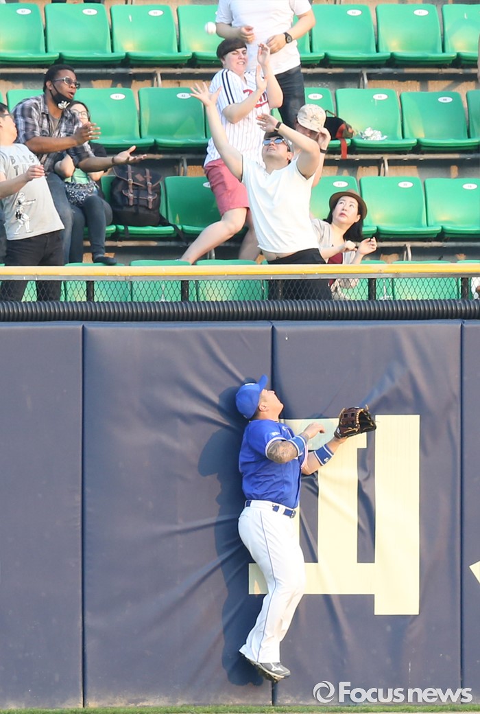 (서울=포커스뉴스) 9일 서울 잠실구장에서 열린 2016 프로야구 삼성-LG 경기 2회말 2사후 삼성 좌익수 최형우가 LG 유강남의 홈런 타구를 쫓아 펜스에 부딪히고 있다.