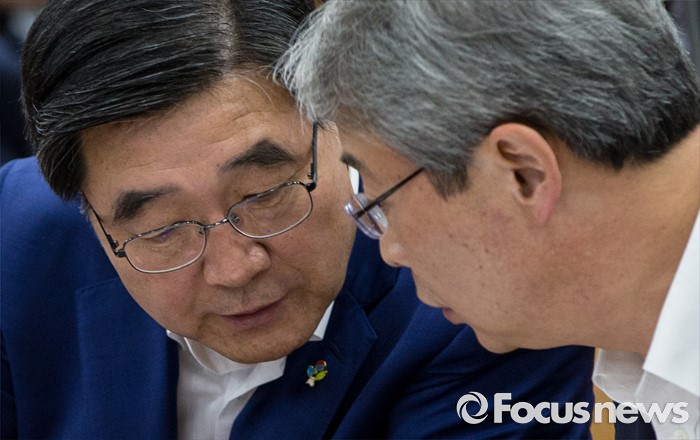 (서울=포커스뉴스) 8일 오전 서울 종로구 정부서울청사에서 열린 구조조정 관계장관회의에 참석한 이기권 고용노동부 장관(왼쪽)과 임종룡 금융위원장이 대화하고 있다.