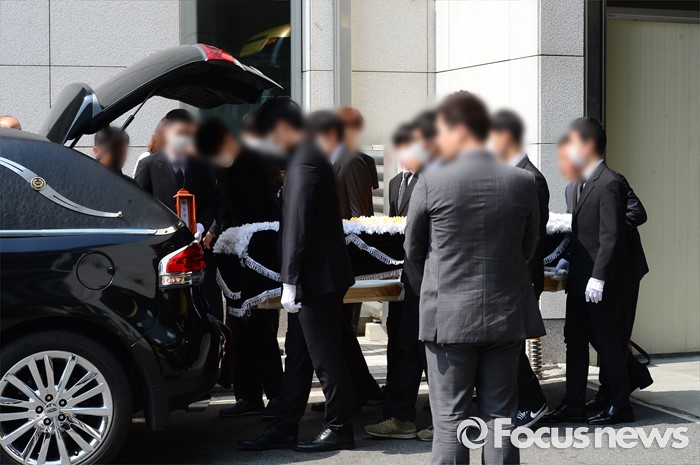 (서울=포커스뉴스) 서울 지하철 2호선 구의역에서 스크린도어를 정비하다가 숨진 김 모 군의 발인일인 9일 오전 서울 광진구 건국대학교병원 장례식장에서 고인의 관이 영구차에 실리고 있다.