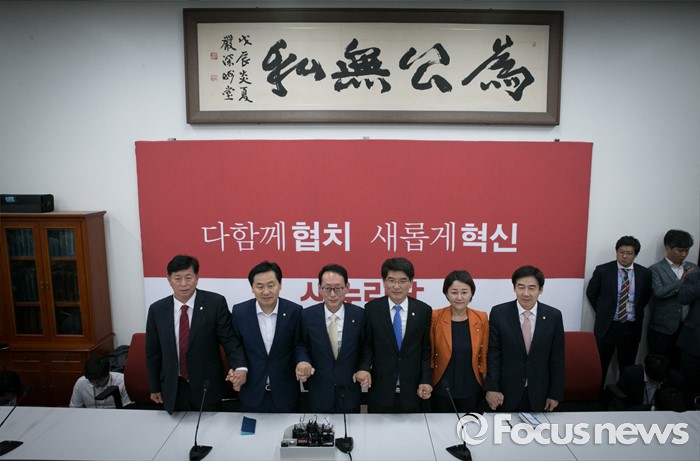 (서울=포커스뉴스) 여야 3당이 20대 국회 원구성에 합의한 8일 오후 서울 여의도 국회 새누리당 원내대표실에서 3당 원내지도부 회동 결과를 발표한 의원들이 취재진을 향해 포즈를 취하고 있다. 왼쪽부터 김명연 새누리당 원내대변인, 김관영 국민의당 원내수석부대표, 김도읍 새누리당 원내수석부대표, 박완주 더불어민주당 원내수석부대표, 이재정 원내대변인, 이용호 국민의당 원내대변인.