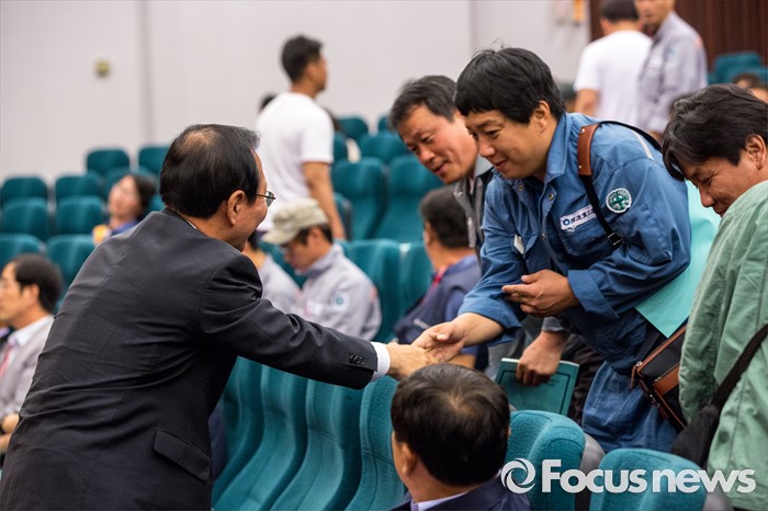(서울=포커스뉴스) 노회찬 정의당 원내대표가 9일 오전 서울 여의도 국회도서관 강당에서 열린 '위기의 조선산업 및 노동자 구조조정 해법 모색 대토론회'에 참석한 조선산업 노동자와 악수 하고 있다.