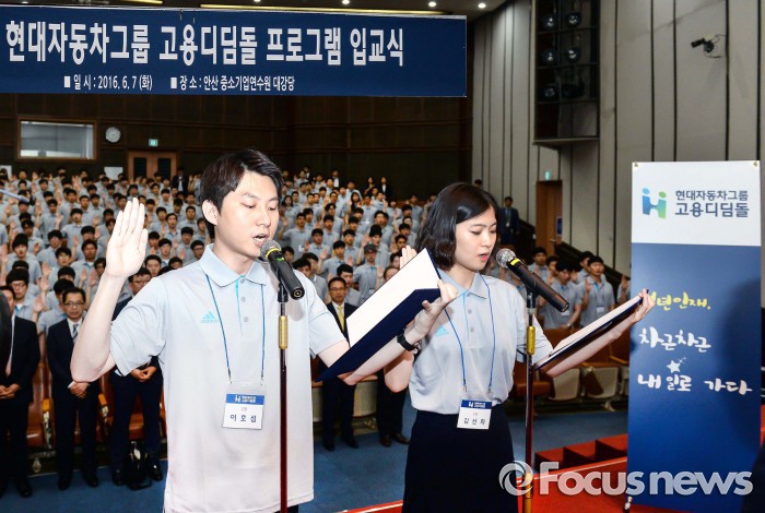 (서울=포커스뉴스) 현대자동차그룹은 지난 7일 중소기업연수원 대강당에서 한성권 현대차그룹 인재개발원장, 권기섭 고용노동부 직업능력정책국장, 박인철 현대기아차 협력회 부회장 등 관계자와 프로그램 참가자 400명이 참석한 가운데 고용디딤돌 2기 입교식을 진행했다.