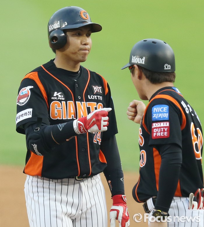 (서울=포커스뉴스) 10일 서울 잠실구장에서 열린 2016프로야구 롯데-두산 경기 3회초 2사 3루에서 롯데 김문호가 우전 적시타를 치고 정보명 코치의 축하를 받고 있다.