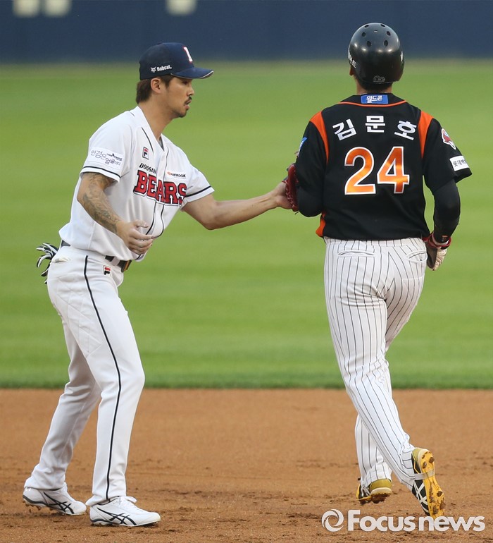(서울=포커스뉴스) 10일 서울 잠실구장에서 열린 2016프로야구 롯데-두산 경기 3회초 2사 1루에서 롯데 1루주자 김문호가 김상호 타석때 투수 견제구에 걸려 2루로 뛰다 아웃되고 있다.