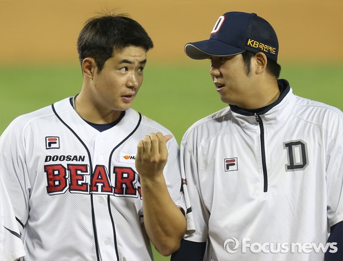 (서울=포커스뉴스) 10일 서울 잠실구장에서 열린 2016프로야구 롯데-두산 경기에서 6회말 역전 3점 홈런을 날려 승리의 주인공이 된 두산 김재환이 장원준과 대화하고 있다.