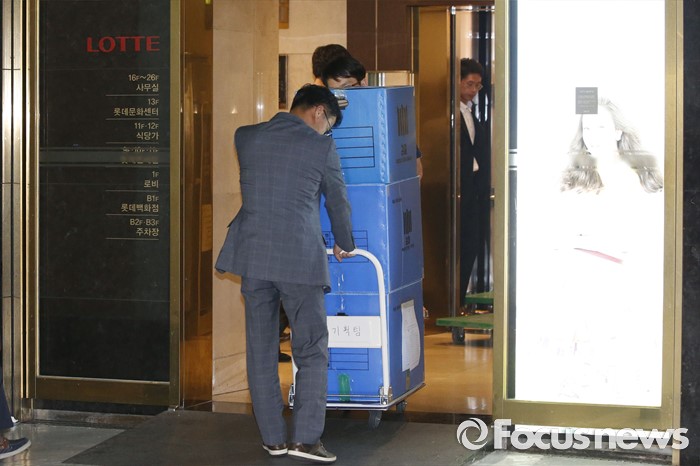 (서울=포커스뉴스) 10일 오후 서울 중구 소공동 롯데호텔에서 검찰 수사관들이 롯데그룹 정책본부 등 계열와 신동빈 롯데그룹 회장 집무실에서 압수수색한 서류를 화물차에 싣고 있다.