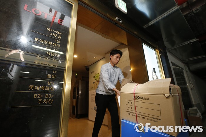 (서울=포커스뉴스) 10일 오후 서울 중구 소공동 롯데호텔에서 검찰 수사관들이 롯데그룹 정책본부 등 계열와 신동빈 롯데그룹 회장 집무실에서 압수수색한 서류를 화물차에 싣고 있다.