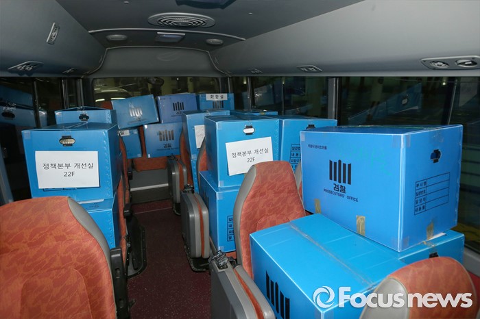 (서울=포커스뉴스) 10일 오후 서울 중구 소공동 롯데호텔에서 검찰 수사관들이 롯데그룹 정책본부 등 계열와 신동빈 롯데그룹 회장 집무실에서 압수수색한 서류를 화물차에 싣고 있다.