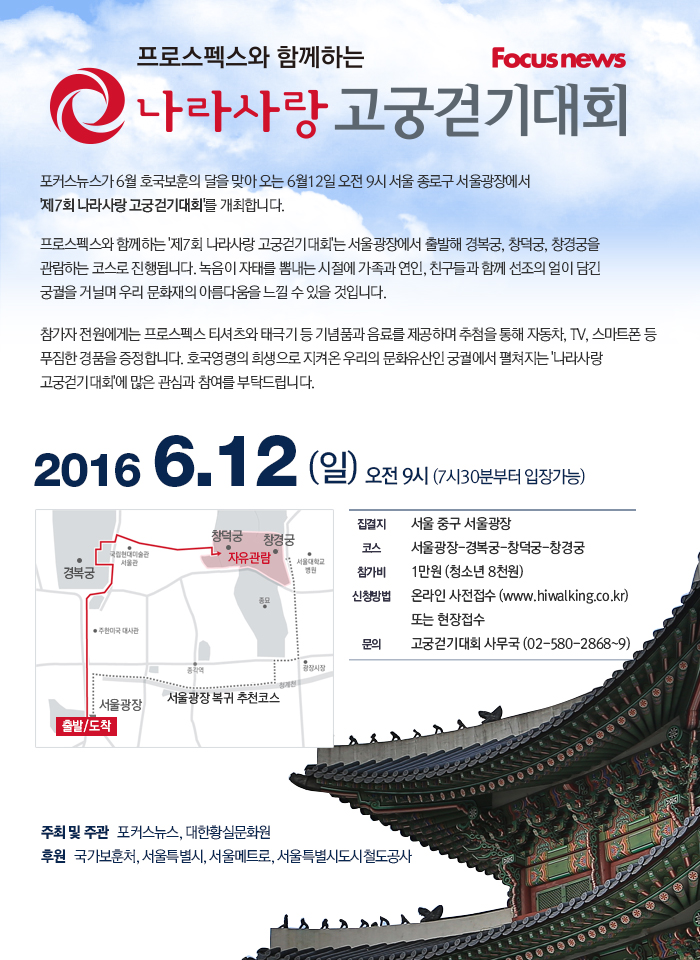 걷기대회와 함께하고 싶다면 행사 당일 현장 부스에서 접수할 수 있다. 참가비는 성인 1만원, 청소년 8000원이다.오는 12일 서울 중구 서울광장에서 열리는 '제7회 나라사랑 고궁걷기대회' 포스터. <사진출처=나라사랑 고궁걷기대회 홈페이지>