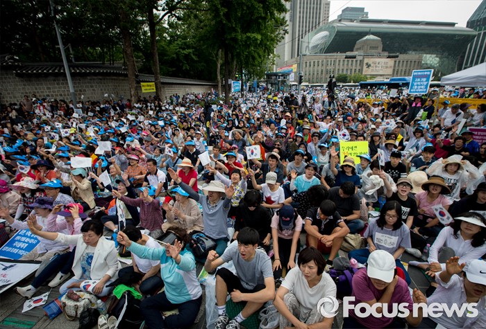 (서울=포커스뉴스) 11일 오후 서울 중구 대한문 앞에서 열린 '2016 서울광장 동성애축제 반대 국민대회'에서 참석자들이 동성애를 반대하는 구호를 외치고 있다.