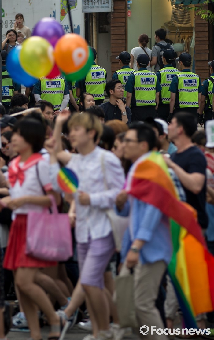 (서울=포커스뉴스) 11일 오후 제17회 퀴어문화축제 참가자들이 서울광장을 출발해 명동 일대를 지나며 퀴어퍼레이드를 벌이고 있다.