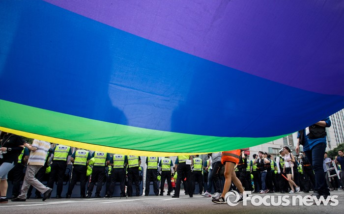(서울=포커스뉴스) 11일 오후 제17회 퀴어문화축제 참가자들이 서울광장을 출발해 을지로일대를 지나며 퀴어퍼레이드를 벌이고 있다.
