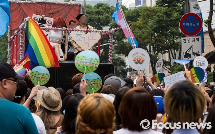 (서울=포커스뉴스) 11일 오후 제17회 퀴어문화축제 참가자들이 서울광장을 출발해 을지로일대를 지나며 퀴어퍼레이드를 벌이고 있다.