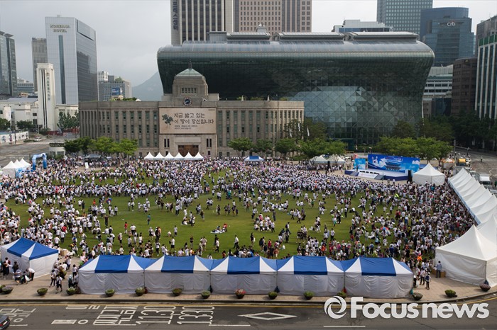 (서울=포커스뉴스) 12일 오전 서울 중구 서울시청 광장에서 열린 제 7회 나라사랑 고궁걷기 대회에 시민들이 참가하고 있다.