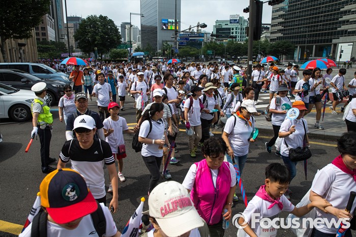 (서울=포커스뉴스) 12일 오전 서울 중구 서울시청 광장에서 열린 '제7회 나라사랑 고궁걷기 대회'에 참가한 시민들이 경복궁을 향해 걷고 있다.