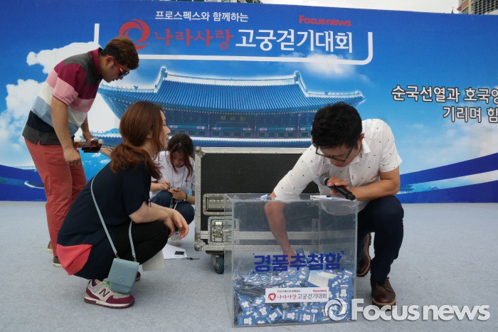 (서울=포커스뉴스) 12일 오전 서울 중구 서울시청 광장에서 열린 '제7회 나라사랑 고궁걷기 대회'에서 사회를 맡은 조영구씨가 경품추첨을 하고 있다.
