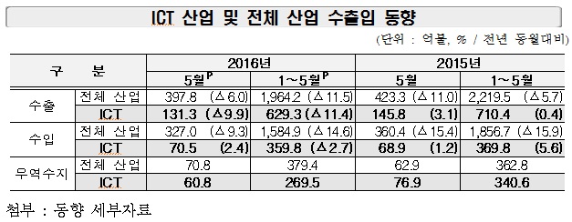 ICT 수지는 60억8000만달러 흑자를 기록, 전체 수지 흑자(70억8000만달러)을 견인했다.5월 ICT 수출입 동향.<표제공=미래부>
