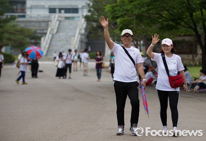 (서울=포커스뉴스) 12일 오전 서울 중구 서울시청 광장에서 열린 제 7회 나라사랑 고궁걷기 대회에 참가한 시민들이 경복궁을 지나 창경궁을 향해 걷고 있다.