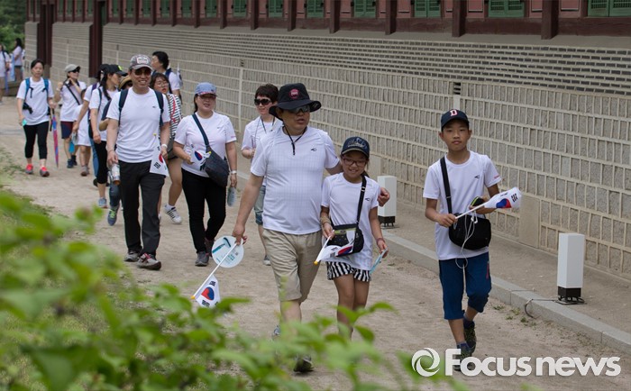 (서울=포커스뉴스) 12일 오전 서울 중구 서울시청 광장에서 열린 제 7회 나라사랑 고궁걷기 대회에 참가한 시민들이 경복궁을 지나 창경궁을 향해 걷고 있다.