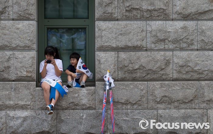 (서울=포커스뉴스) 12일 오전 서울 중구 서울시청 광장에서 열린 제 7회 나라사랑 고궁걷기 대회에 참가한 어린 아이들이 출발 전 휴식을 취하고 있다'