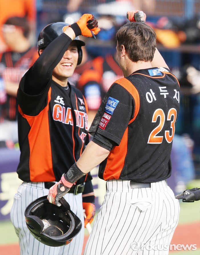 (서울=포커스뉴스) 12일 서울 잠실구장에서 열린 2016 프로야구 롯데-두산 경기 3회초 롯데 선두타자 아두치가 중견수를 넘기는 3루타와 송구 실책을 틈타 홈까지 달려 득점한후 강민호의 환영을 받고 있다.