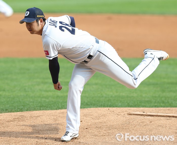 (서울=포커스뉴스) 12일 서울 잠실구장에서 열린 2016프로야구 롯데-두산 경기에서 1회초 두산 선발투수 장원준이 투구하고 있다.