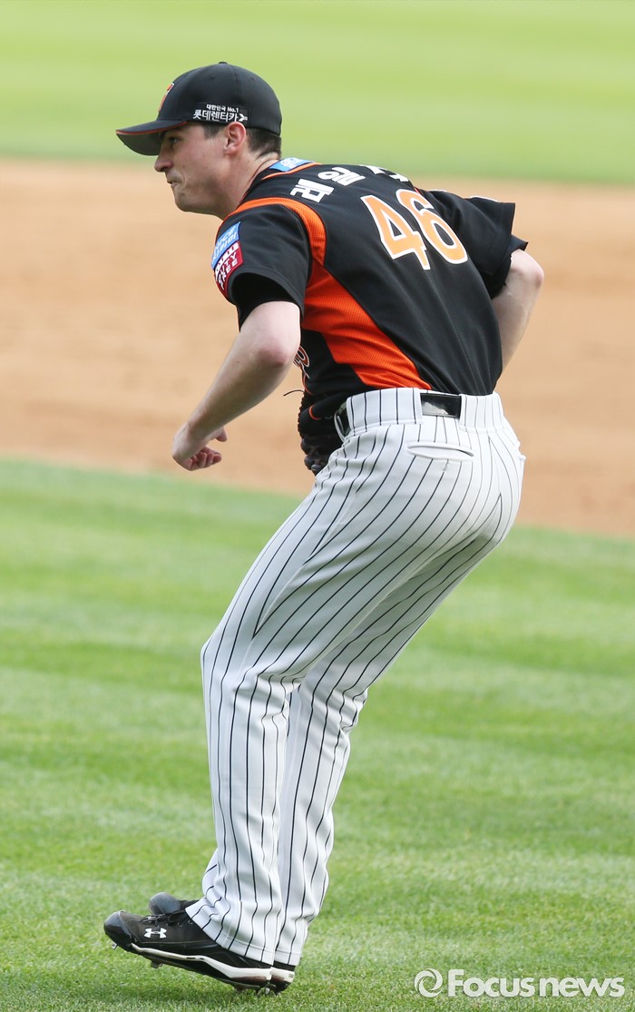 (서울=포커스뉴스) 12일 서울 잠실구장에서 열린 2016 프로야구 롯데-두산 경기 4회말 1사 만루에서 롯데 투수 레일리가 두산 허경민의 땅볼 타구를 잡아 송구 실책을 하고 펄쩍 뛰며 아쉬워하고 있다.