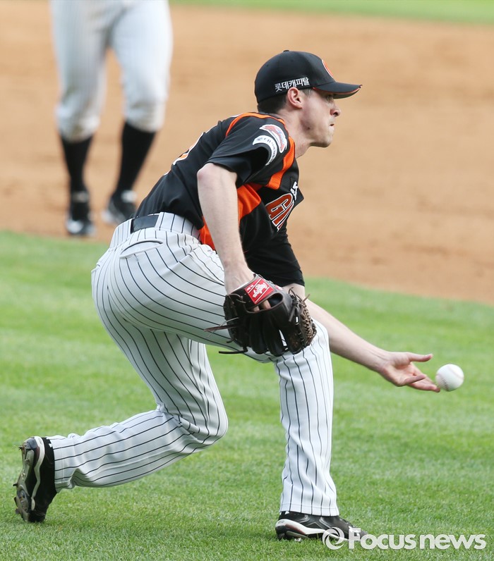 (서울=포커스뉴스) 12일 서울 잠실구장에서 열린 2016 프로야구 롯데-두산 경기 4회말 1사 만루에서 롯데 투수 레일리가 두산 허경민의 땅볼 타구를 잡아 1루로 토스하고 있다.