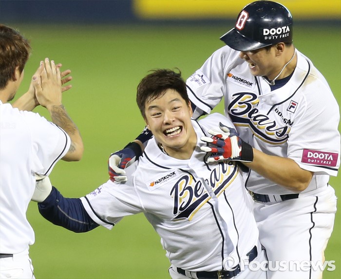 (서울=포커스뉴스) 12일 서울 잠실구장에서 열린 2016 프로야구 롯데-두산 경기에서 연장 11회말 끝내기 2루타를 친 두산 민병헌이 동료들과 환호하고 있다.
