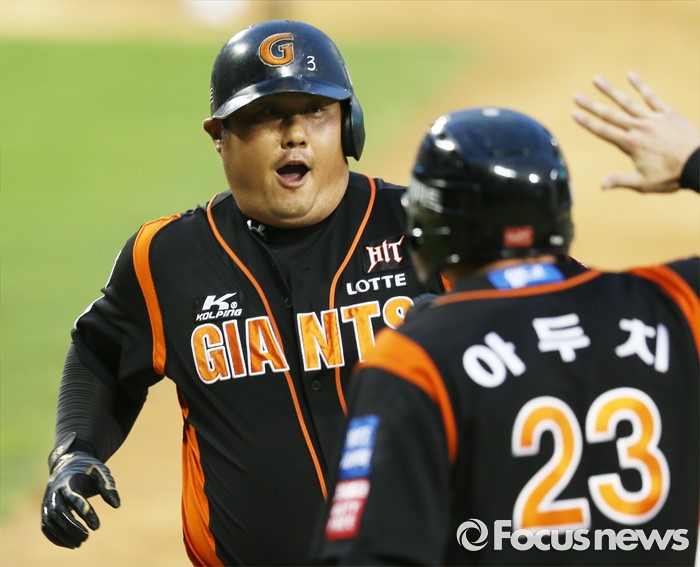 (서울=포커스뉴스) 12일 서울 잠실구장에서 열린 2016 프로야구 롯데-두산 경기 9회초 2사 1루에서 롯데 최준석이 동점 우월 홈런을 치고 선행주자 아두치의 환영을 받으며 홈인하고 있다.