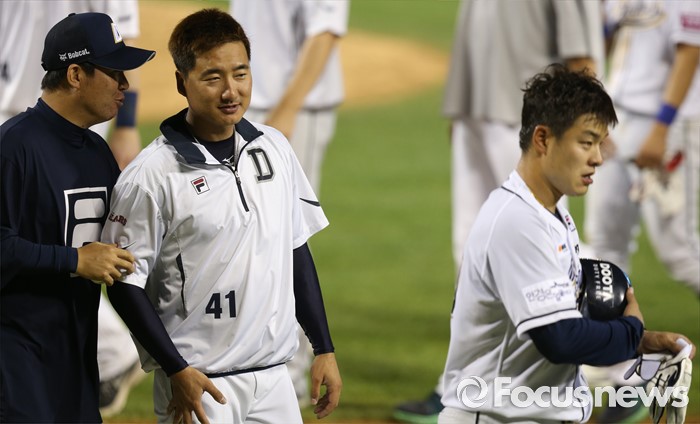 (서울=포커스뉴스) 12일 서울 잠실구장에서 열린 2016 프로야구 롯데-두산 경기에서 9회 동점 홈런을 맞은 정재훈이 이현승과 대화하고 있다.