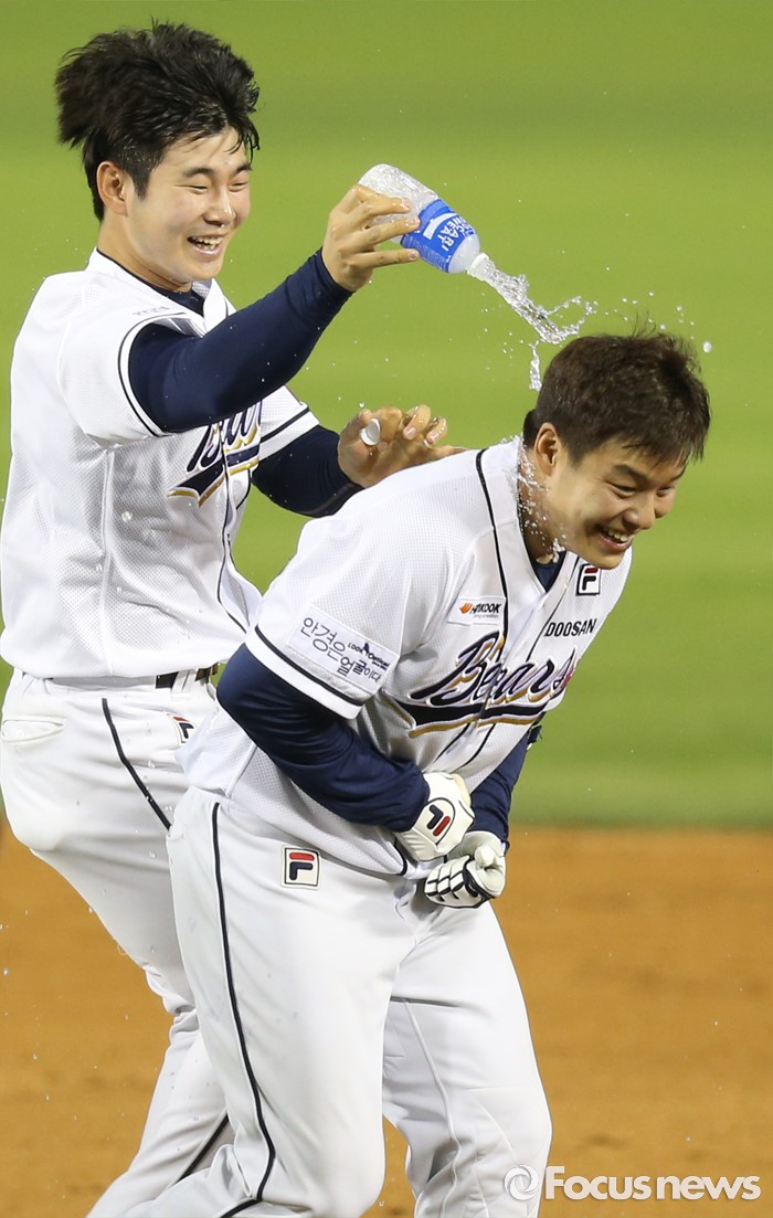 (서울=포커스뉴스) 12일 서울 잠실구장에서 열린 2016 프로야구 롯데-두산 경기에서 연장 11회말 끝내기 2루타를 친 두산 민병헌에게 동료들이 축하의 물세례를 하고 있다.